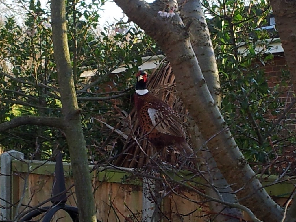 'tis a boy pheasant (girlies are greyish brown), and I am disappointed you didn't bag it..... 40 mins in the oven, a nice sauce and mmmmmmmmm...... though I must confess, never seen one in a tree before....