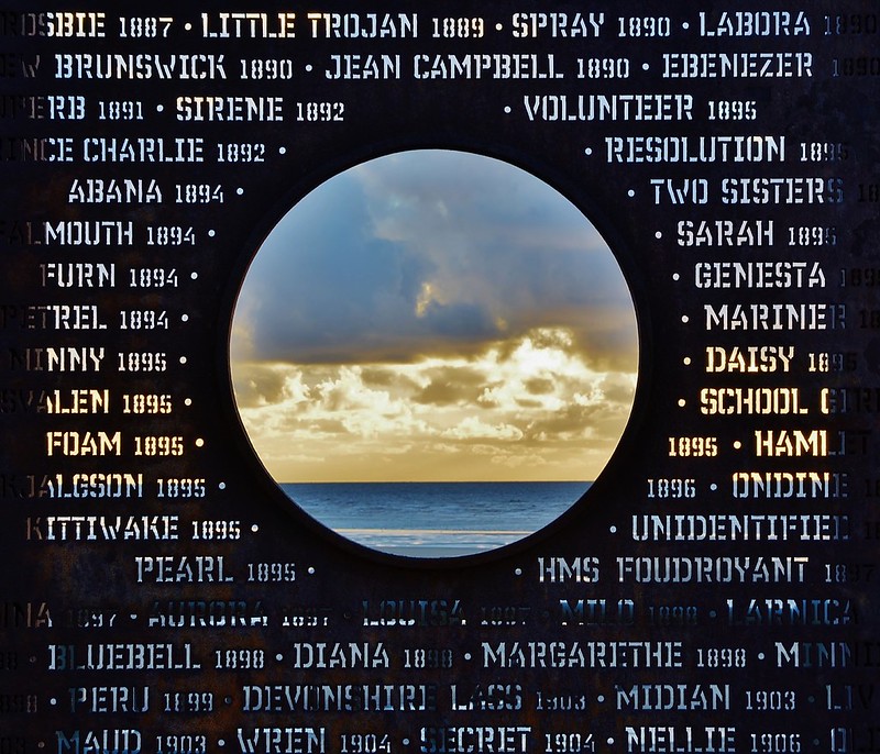 This is a metal sculpture marking the ships wrecked on the Fylde coast since 1643 with the names and dates cut out from the metal.